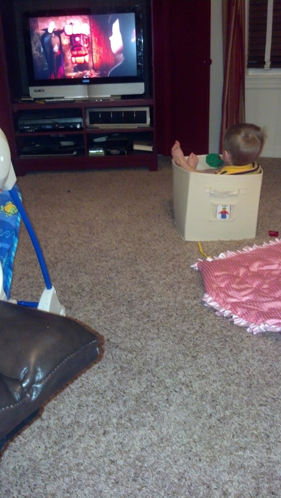 Here we are as a family watching a movie (Hotel Transylvania). We're all on the couch. Except Jace, who sitting in the lego bin.